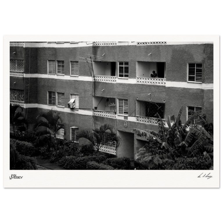 A quiet moment framed in concrete, Balcony Life captures the façade of a Cuban housing block in crisp black and white. The grid of shutters, tangled wires, and lived-in balconies reflect the rhythm of everyday life – where small personal scenes unfold behind patterned barriers and open doors. A lone figure watches from a balcony, adding a human note to the structured geometry.