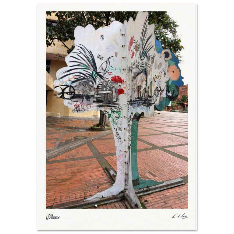 A once-vivid public artwork, shaped like a blossoming tree, now fades beneath layers of urban calligraphy. Tags, stickers and the elements blur its original intent but in doing so, they create something new. The contrast between the painted flora and concrete plaza echoes Bogotá’s dance between the organic and the constructed, the celebrated and the defaced.