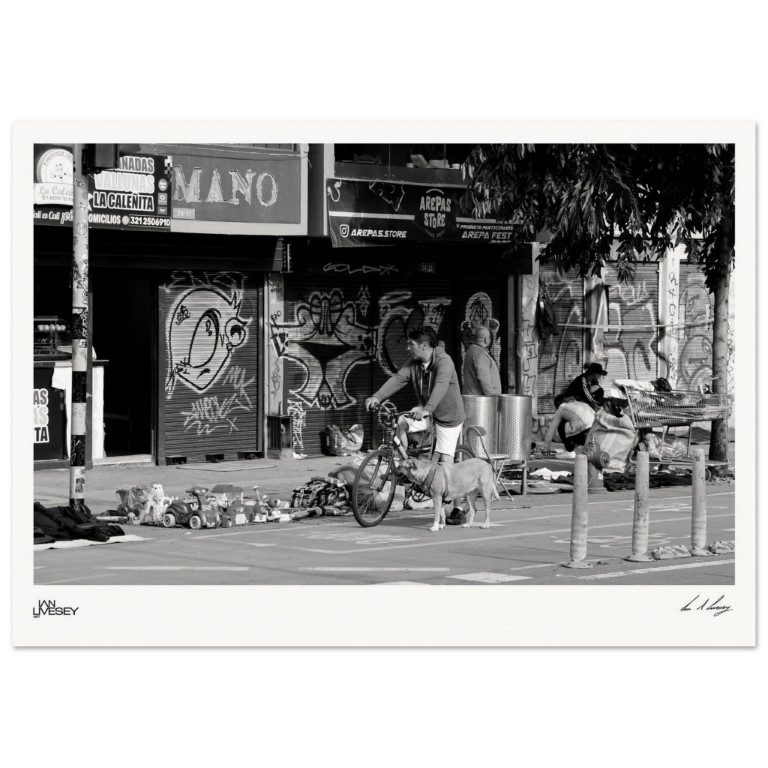 A quiet moment on a Bogotá street is frozen in high contrastgraffiti-covered shutters frame the backdrop while toys, makeshift stalls, and carts line the pavement. A man pauses on his bike, his dog standing faithfully at his side, while street vendors go about their trade behind him. In this stripped-down palette, the raw textures and interactions take centre stagehighlighting the resilience, rhythm and resourcefulness of everyday life in the city.