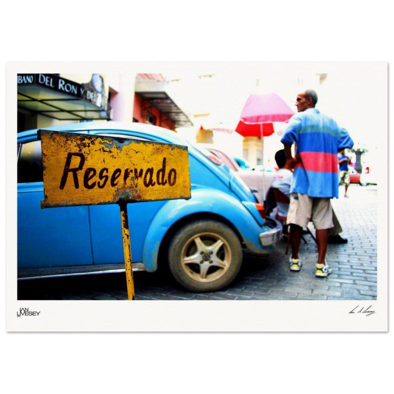 This vibrant photographic print captures the nostalgic charm of a classic blue VW Beetle car set against the rustic backroads of Cuba. Shot by Ian Livesey, evoking a bygone era of motoring elegance.