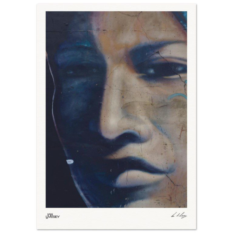 This intimate close-up by Ian Livesey captures the haunting beauty of a weathered mural on a city wall in Colombia. The subject a stoic, solemn face emerges from textured concrete, its expression timeless, yet worn by time. Cracks in the wall carve through the features, creating a sense of fragility beneath the painted confidence.