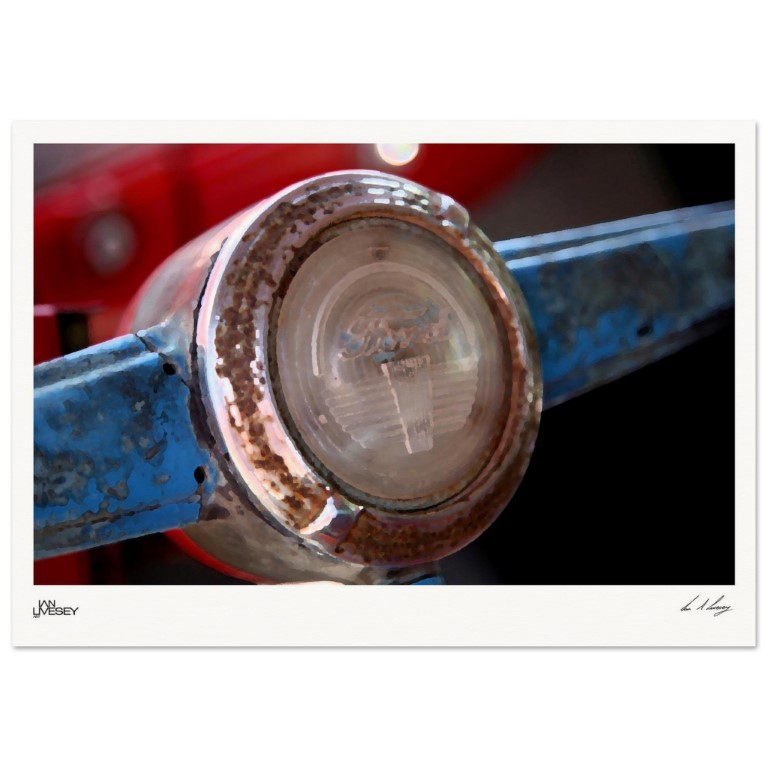A graphic reinterpretation of a vintage Ford’s steering wheel, Cuban Ford – Stylised Steering transforms rust and wear into an abstract study in form and colour. The vibrant red and blue tones are softened into painterly textures, while the corroded metal and faded emblem become emblems of time, place and legacy.