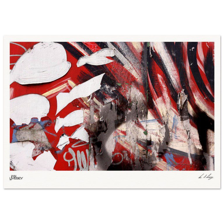 A clash of vivid red, deep black, and chalky white shapes tear across the surface like kinetic brushstrokes frozen mid-motion. Layers of crumbling posters, spray paint, and peeling pigment merge in this visual riot, evoking the pace and pulse of the city. There’s movement in every tear, intention in every faded mark. Urban decay becomes composition, where texture, time, and tension meet.