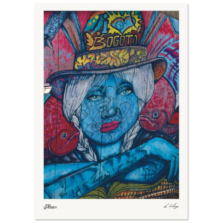 Bold, proud, and unmissably vibrant — this street mural is a full-hearted love letter to Bogotá. The piercing gaze of the blue-faced figure is framed by silver braids and crowned with a graffiti-scrawled top hat bearing the iconic “I ? Bogotᔠmessage.