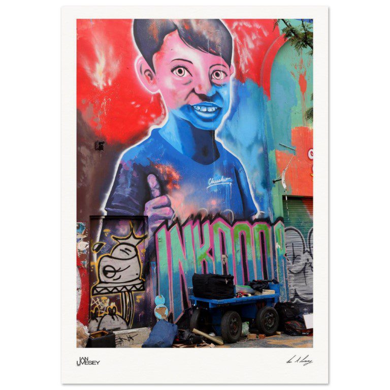 In this bold mural, a child beams with bright cartoon-like enthusiasm, framed by surreal shades of blue and red — a visual shout against the muted chaos at street level. The word “INKDORD”, scrawled in towering neon-style lettering, anchors the scene, though its full meaning remains enigmatic — a blend of street alias, brand, or artistic signature.
