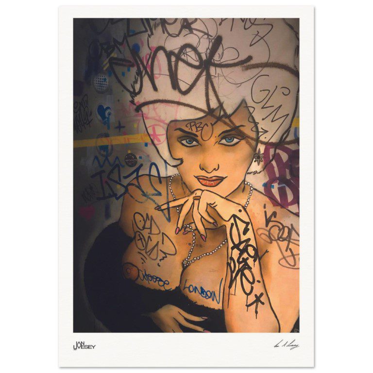 In the heart of Londons ever-evolving urban canvas, a glamourous femme fatale peers through layers of scrawled tags and spray paint. This striking mural, part pin-up, part punk rebellion, blurs the line between elegance and anarchy. Her pearls and poised fingers evoke classic beauty, yet shes defaced, reclaimed and recontextualised by the street.
