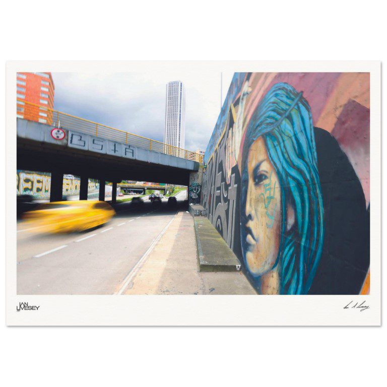 To the left, the blur of a yellow car races beneath a concrete overpass, symbolising Bogotás relentless speed. The city stretches into the distance, layered with graffiti and life, while the mural remains motionless a witness to all that passes.