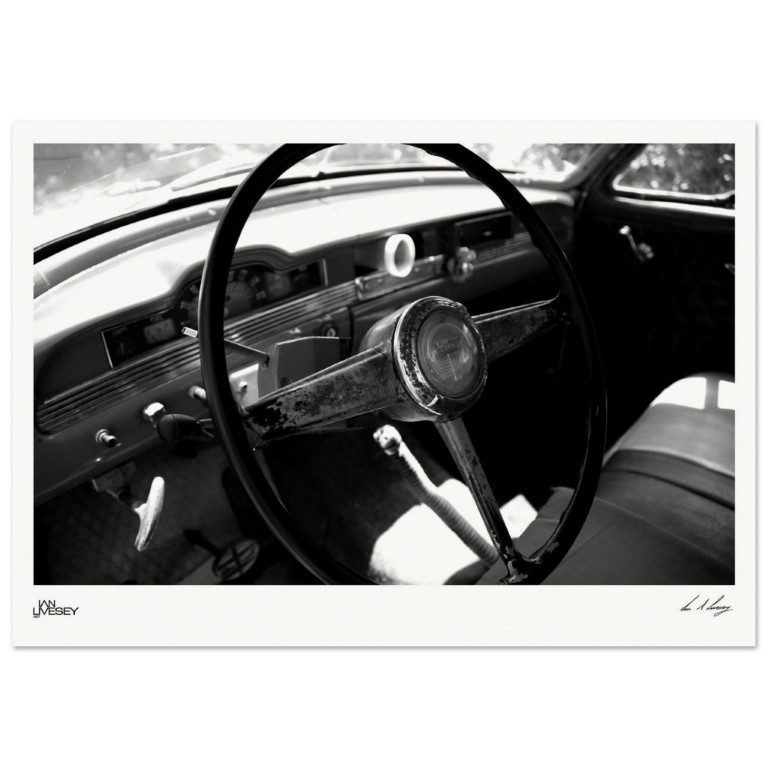 A rich, lived-in portrait of a classic American dashboard, Plymouth Interior immerses us in the drivers seat of a vintage Cuban car. The weathered blue steering wheel, bright red dash, and handmade upholstery speak to decades of adaptation and care. Every crack, chrome strip and colour contrast tells the story of motion and memory under Caribbean skies.